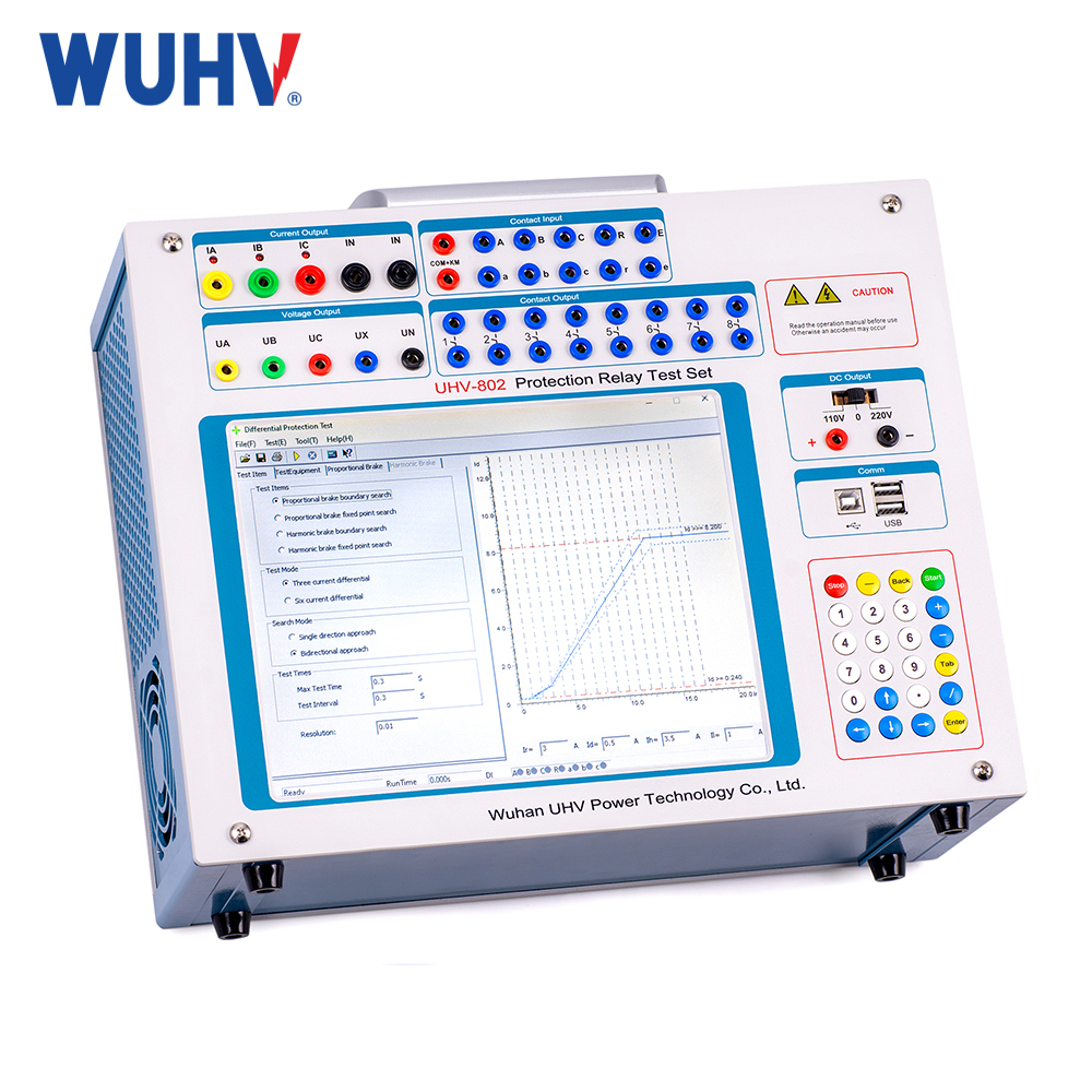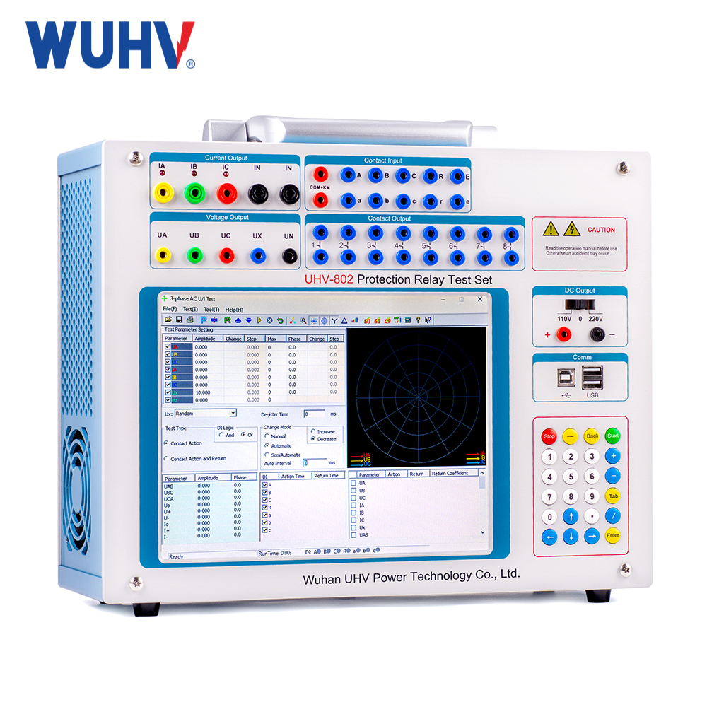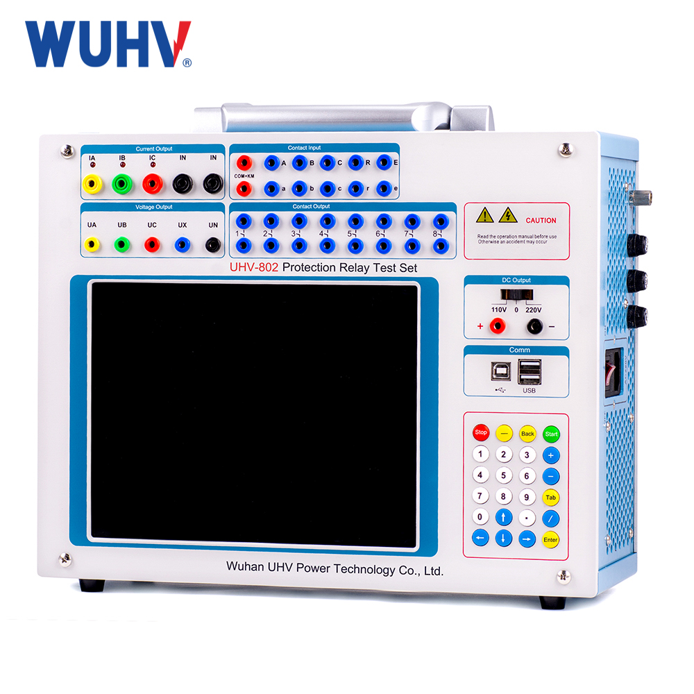 The UHV-803 Three phase relay protection tester is a new miniaturized microcomputer relay protection tester based on DL/T624-1997 "Technical Conditions for Microcomputer relay Protection test Device" issued by the Ministry of Power, which is widely listened to the views of users, summarized the advantages and disadvantages of similar domestic products, and made full use of modern advanced microelectronics technology and devices. The microcomputer relay protection tester adopts the advanced structure of independent operation of a single machine and can also be connected to a laptop computer. The main machine adopts DSP+FPGA structure, true 16-bit DAC output, built-in new modular high-fidelity linear high-power amplifier, 8.4 inch TFT true color display with resolution of 800×600 and industrial keyboard and mouse. WindowsXP operating system, powerful. Small size, high precision. It not only has the superior performance and advanced function of the large tester, but also has the advantages of small, flexible, easy to operate, high reliability, and high performance-price ratio. It is a good tool for continuity workers.